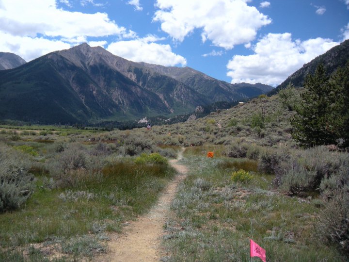 Me leaving Twin Lakes outbound (mile 60) having a moment with Amy in my MT110's
